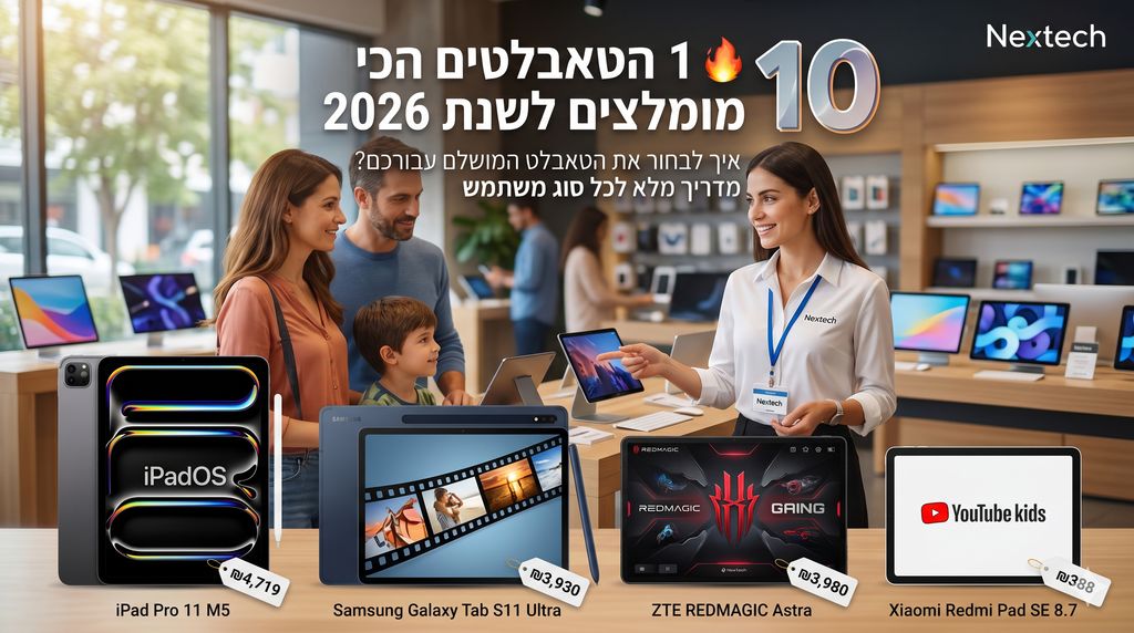 במאמר הבא נסקור עבורכם את 10 הטאבלטים הכי מומלצים לשנת 2026, כל הטאבלטים זמינים דרך חנות הסלולר Nextech, עם המחירים הזולים ביותר בשוק, פירוט מלא, יתרונות, חסרונות והתאמה מדויקת לכל סוג משתמש.